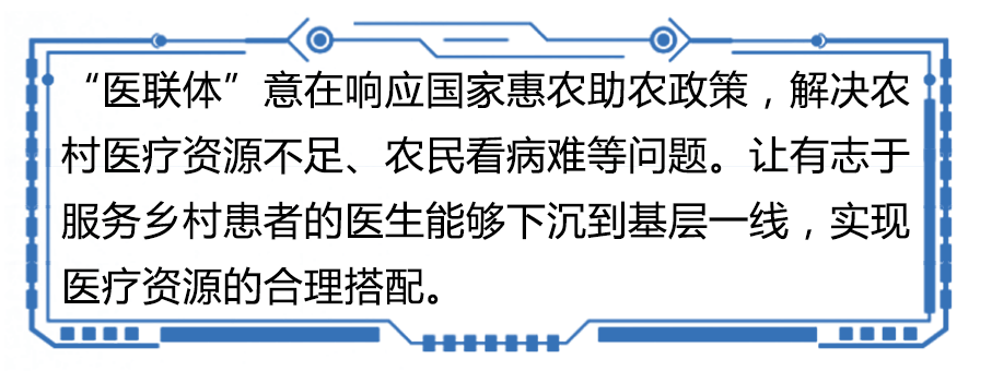 “农联体”来搜集农民看病需求及贫困农民群体的疾病状况,“医联体”将善于治疗该疾病的名医输送到各农村乡镇卫生院,解决农民患者就医问题。